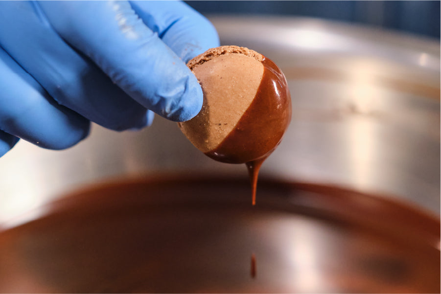構想から発売まで2年、1粒を作るのにのべ1週間かかる生チョコマカロン。